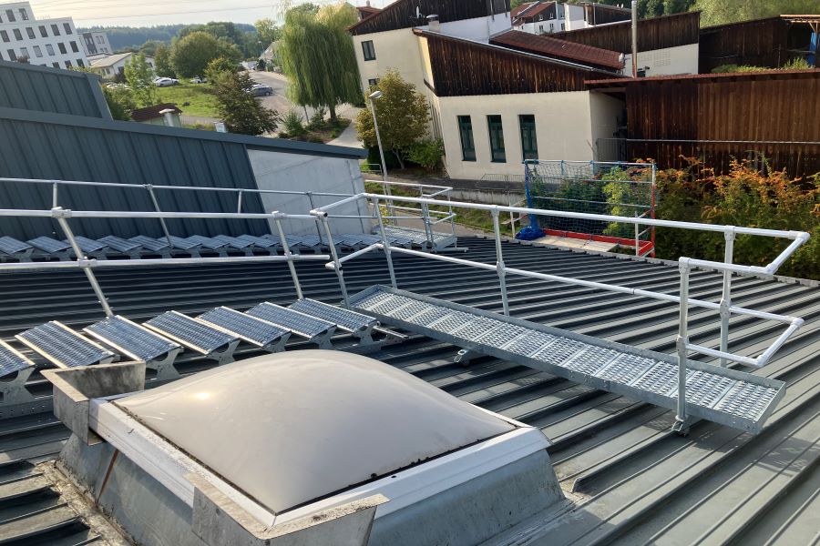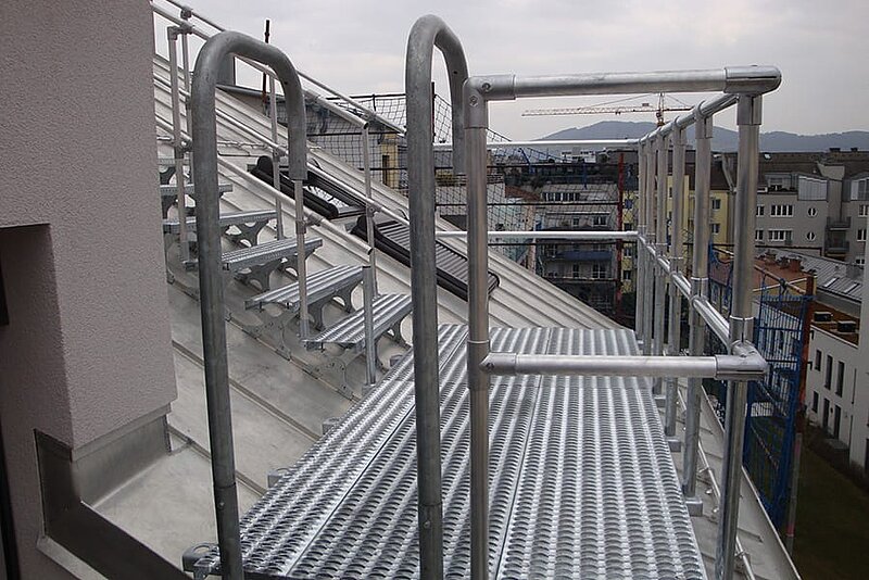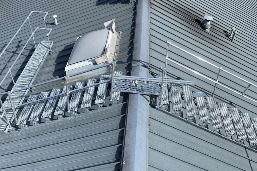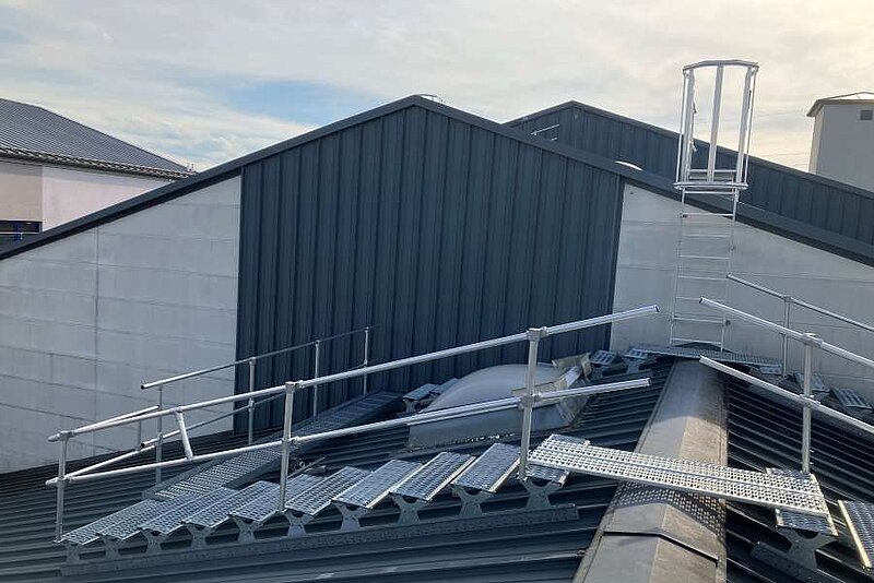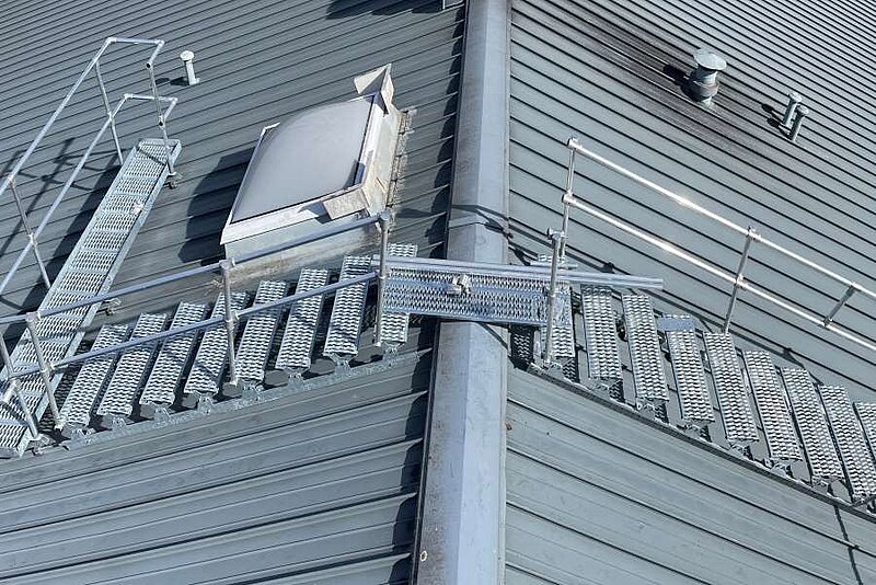 Dach-Rettungsweg u. Fluchtweg als zweiter Rettungsweg (DIN 14094) und in Dach Wartungsweg für Instandhaltungen, Inspektionen usw. (DIN 4426 / DIN EN 516)
